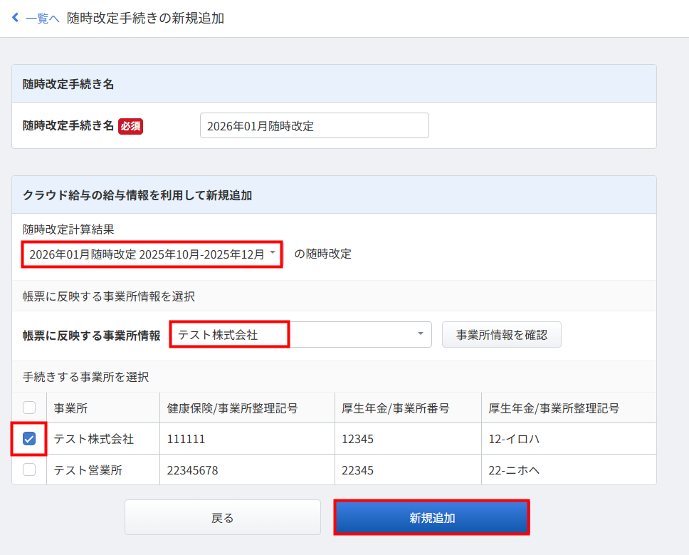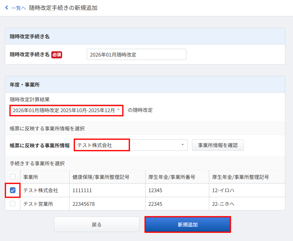 - 「随時改定手続きの新規追加」画面で「随時改定計算結果」「帳票に反映する事業所情報」「手続きする事業所」を選択し、「新規追加」をクリックします。