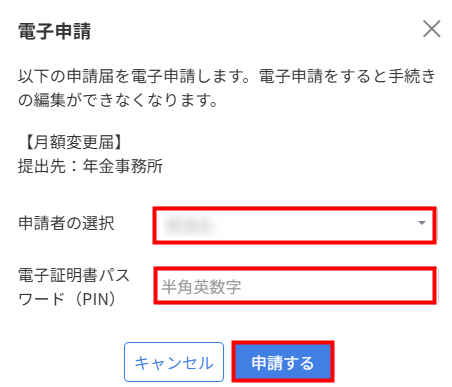 「電子証明書パスワード(PIN)」の項目が表示された場合は、パスワードを入力して「申請する」をクリックします。