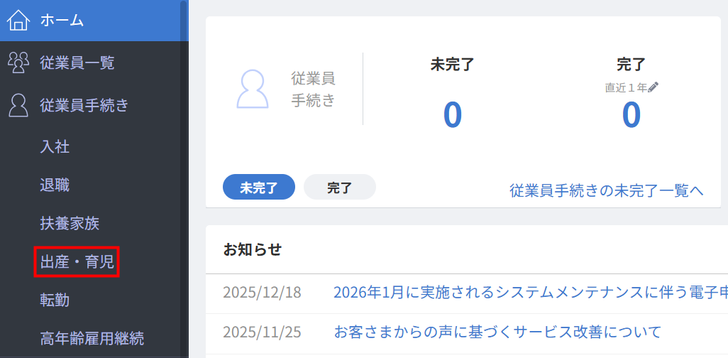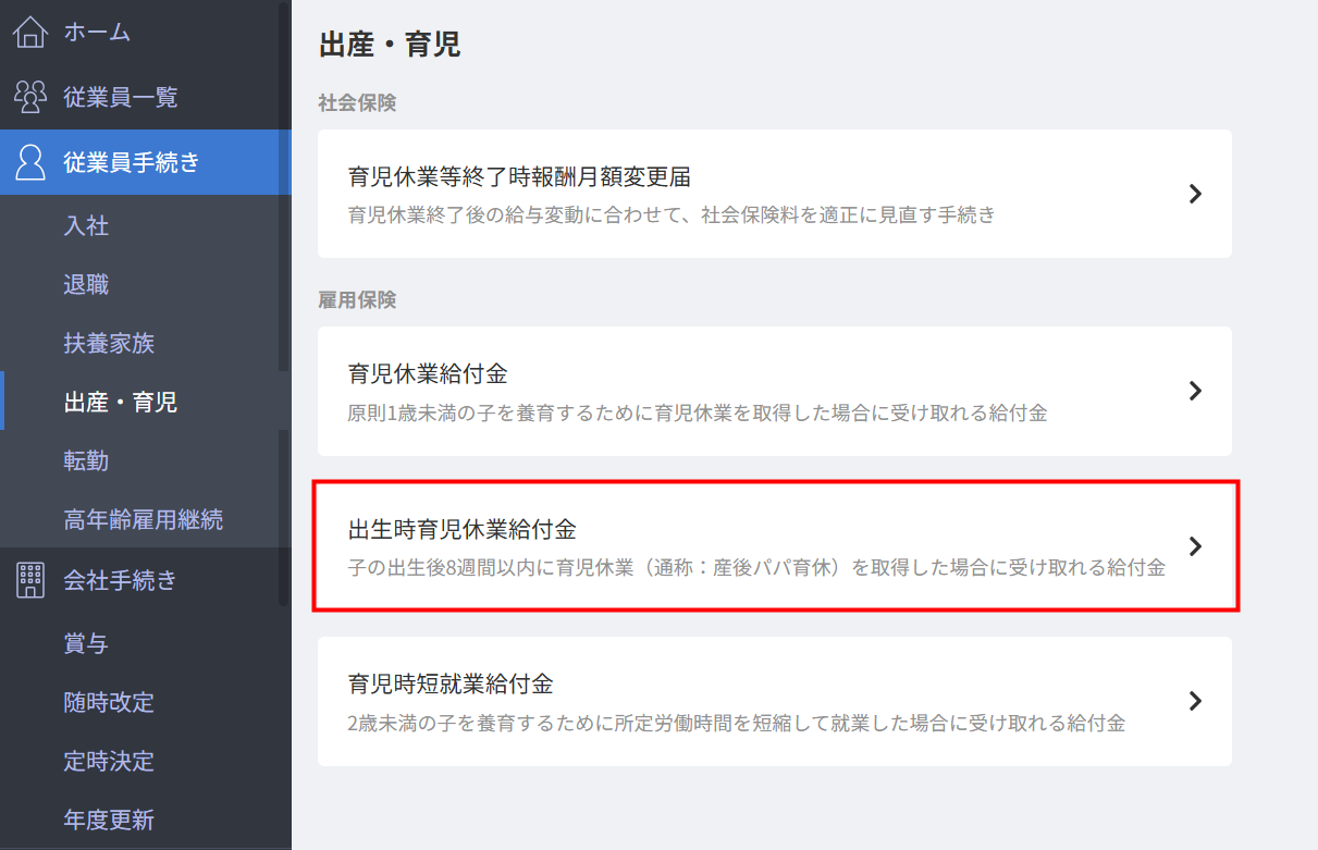 - 左メニューの「従業員手続き」にある「出産・育児」をクリックします。