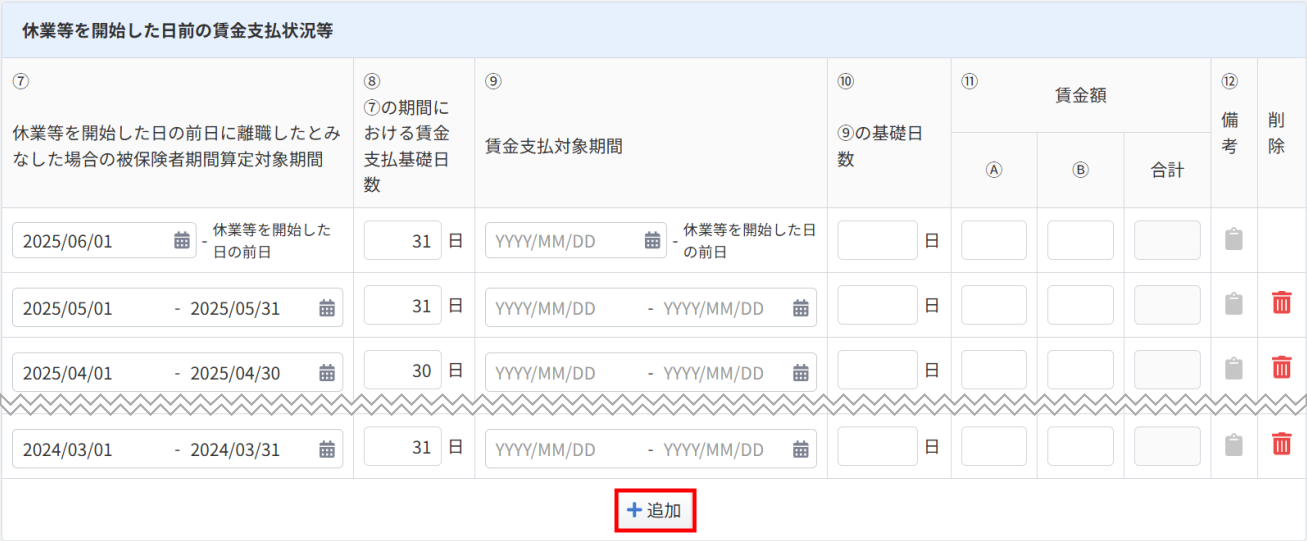 「休業等を開始した日前の賃金支払い状況等」では、出生時育児休業を開始する前の賃金支払い状況について、期間や日数・賃金額を入力します。