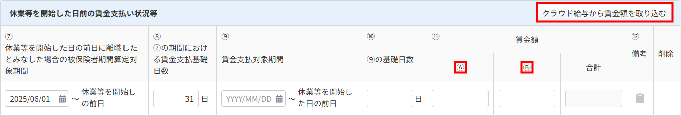 「クラウド給与から賃金額を取り込む」をクリックすると、「マネーフォワード クラウド給与」から「⑨ 賃金支払対象期間」「⑩ ⑨の基礎日数」「⑪ 賃金額」の情報を取り込めます。