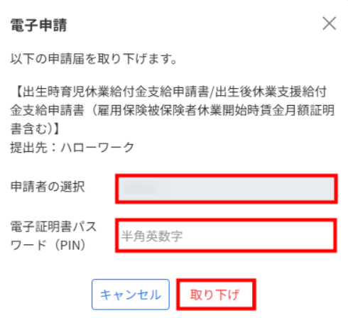 | 申請者の選択 | 「事業者」>「電子申請設定」>「登録名」に登録した申請者から選択します。 | 電子証明書パスワード(PIN) | 電子証明書を取得したときの「電子証明書パスワード」を入力します。詳細はこちらのガイドをご参照ください。 |