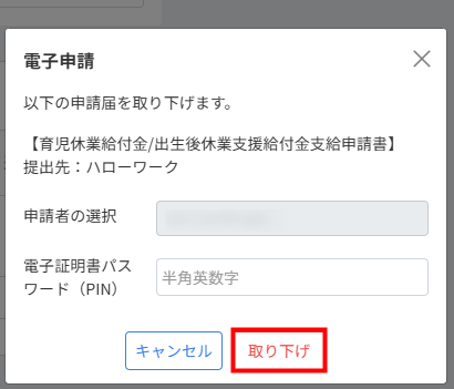 - 「電子申請」画面の「申請者の選択」で申請者を選択し、「取り下げ」をクリックします。「電子証明書パスワード(PIN)」が表示された場合は、パスワードも入力してください。