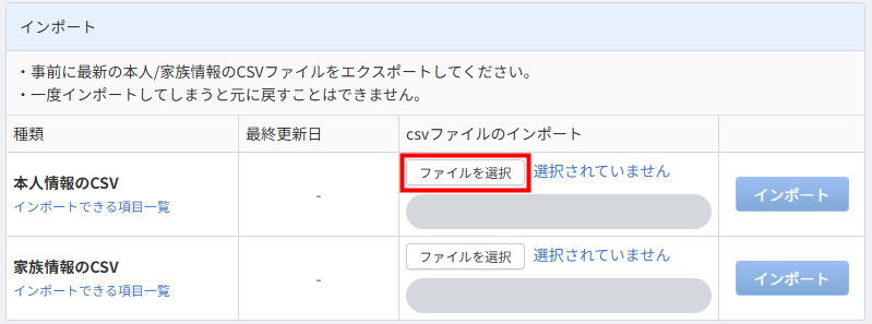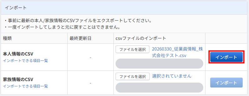 - 従業員情報CSVをインポートする場合は、事前に現在の本人情報CSVと家族情報CSVをエクスポートし、バックアップとして保存してください。