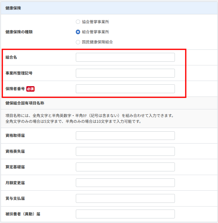 「健康保険」では、「健康保険の種類」や「事業所整理記号」を設定できます。