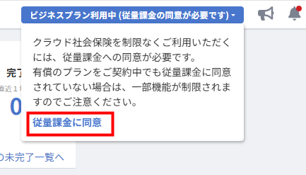 - 「ホーム」画面右上の「●●プラン利用中 (従量課金の同意が必要です)▼」をクリックします。
