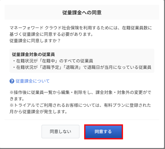 6名以上でご利用の場合は、従業員の登録人数1名につき月額100円(税抜)の従量課金が発生します。