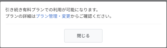 - 「引き続き有料プランでの利用が可能になります。」というメッセージが表示されたことを確認します。
