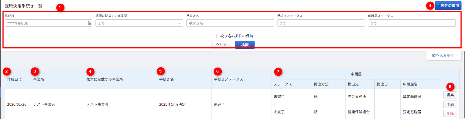 | ⑥ | 手続きステータス | 手続きの「未完了」「完了」が表示されます。 ステータスが「完了」の手続きは編集や削除が行えません。 |