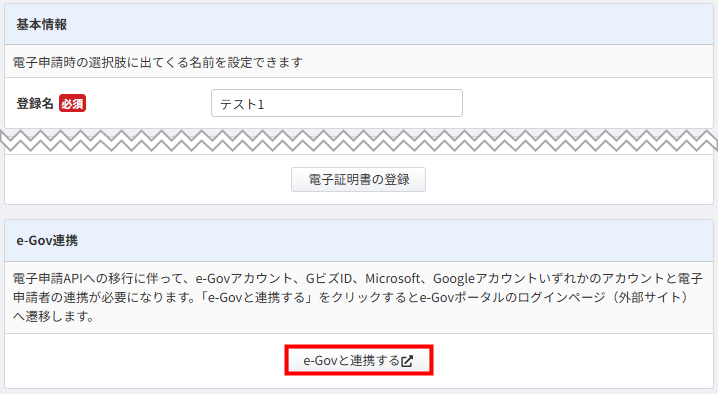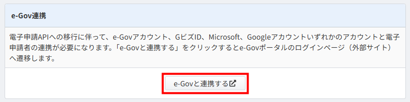 以下の手順では、「e-Govアカウント」を電子申請者と連携する場合を例に説明します。