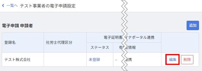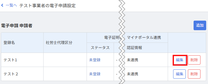 - 「電子申請設定」画面で「テスト1」の「編集」をクリックします。