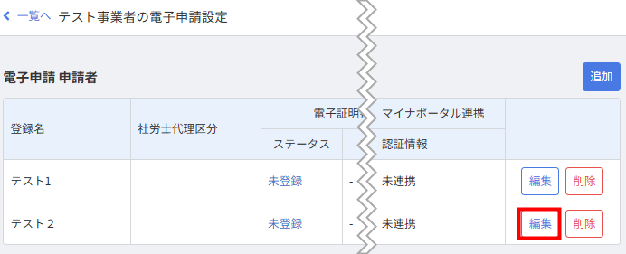 - 「電子申請設定」画面で「テスト2」の「編集」をクリックします。