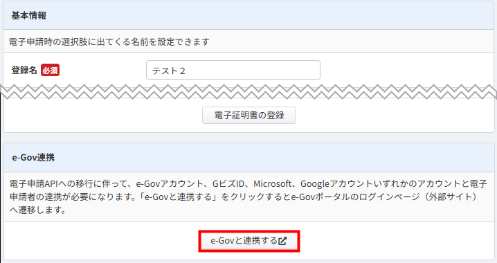 - 「電子申請者の編集」画面下部の「e-Gov連携」で「e-Govと連携する」をクリックします。