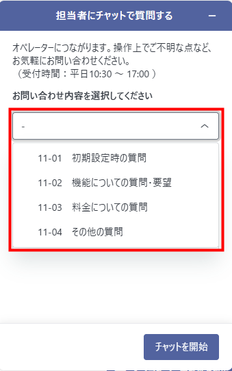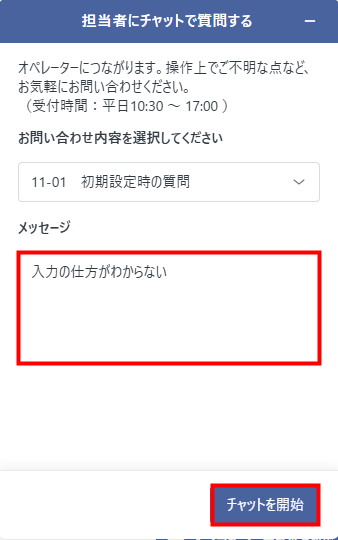 3. 「メッセージ」の箇所にお問い合わせ内容の詳細を入力し、「チャットを開始」をクリックします。