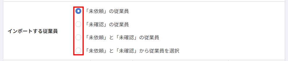 - 「インポートする従業員」で、「マネーフォワード クラウド給与」から従業員情報をインポートする従業員の回収・計算ステータスを選択します。