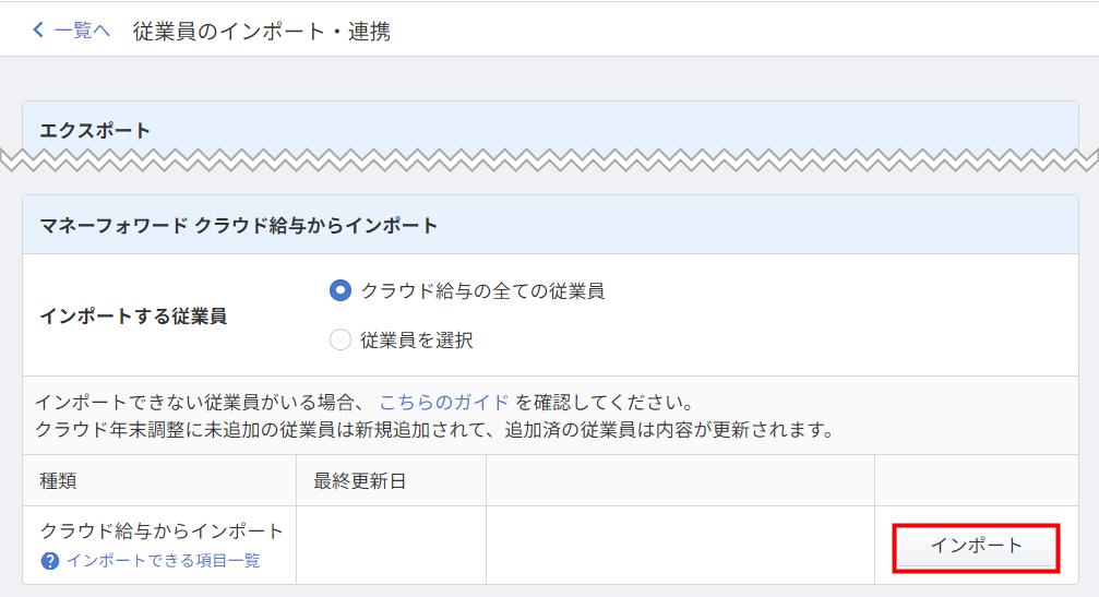 - 続いて、こちらの項を参照し、年末調整手続きでクラウド給与から従業員情報をインポートします。