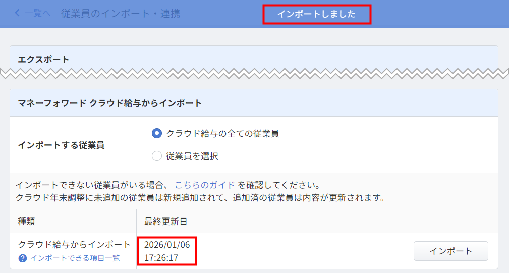 - 画面上部に「インポートしました」というメッセージが表示されたら、「最終更新日」が更新されていることを確認します。