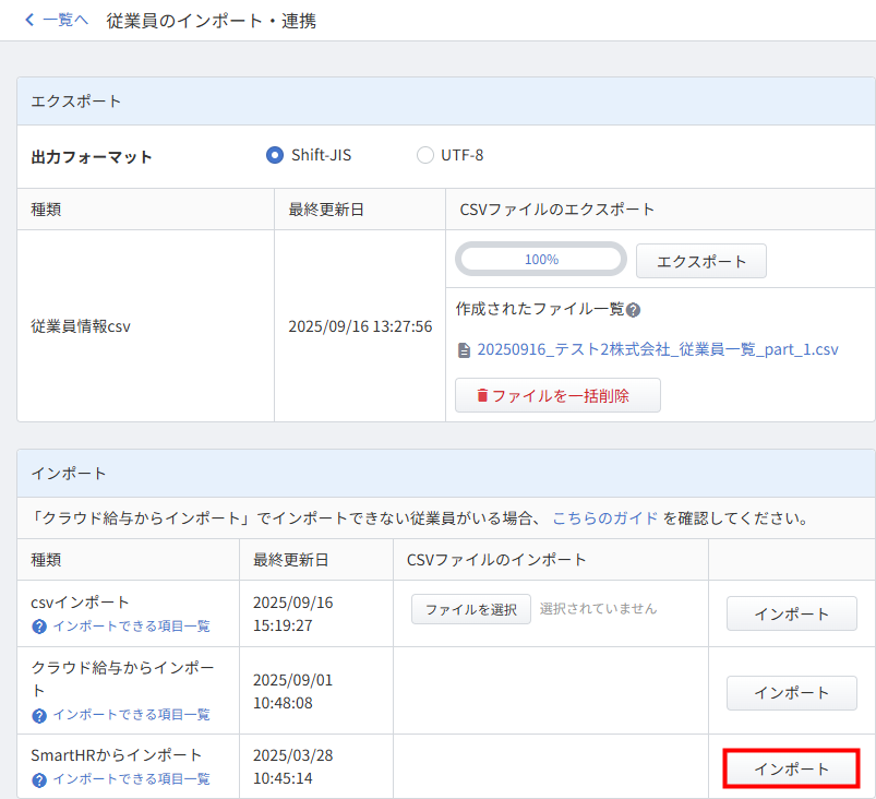 - 「従業員のインポート・連携」画面で「SmartHRからインポート」の「インポート」ボタンをクリックします。