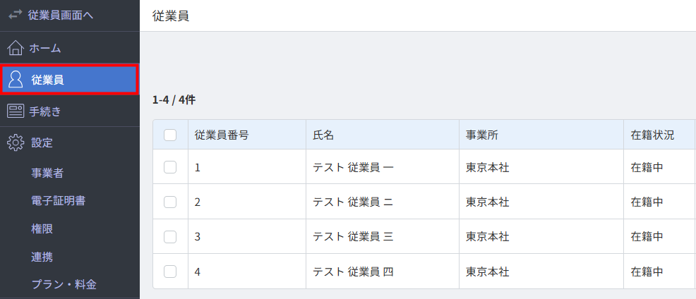 - 「従業員」画面で「連携」欄が空欄であることを確認し、「インポート・連携」ボタンをクリックします。