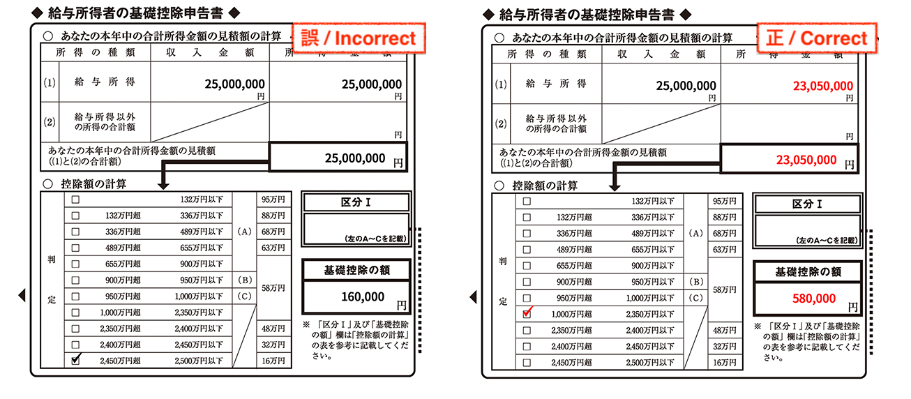 基・配・特・所の「給与所得控除額」が計算されず、「基礎控除の額」に正しい金額が表示されない。
