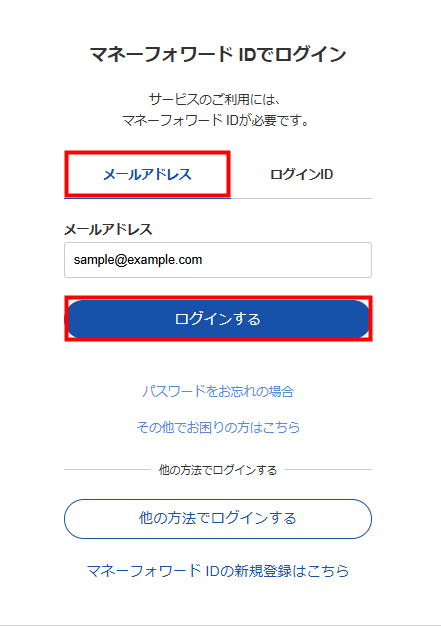 - 「マネーフォワード IDでログイン」画面で「メールアドレス」を選択し、メールアドレスを入力して「ログインする」をクリックします。