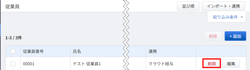 - 「従業員」画面で削除する従業員の「削除」をクリックします。
