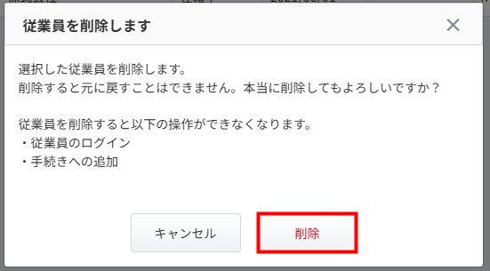 - 「従業員を削除します」画面の内容を確認し、問題がなければ「削除」をクリックします。