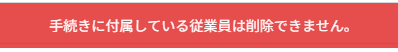 削除を行った場合、「手続きに付属している従業員は削除できません。」というメッセージが表示されます。