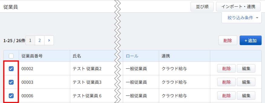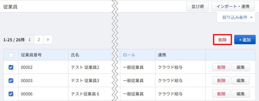 | ③ | 削除 | クリックすると、選択した従業員を一括で削除できます。※ |
