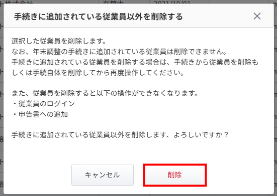 - 「手続きに追加されている従業員以外を削除する」画面の内容を確認し、問題がなければ「削除」をクリックします。
