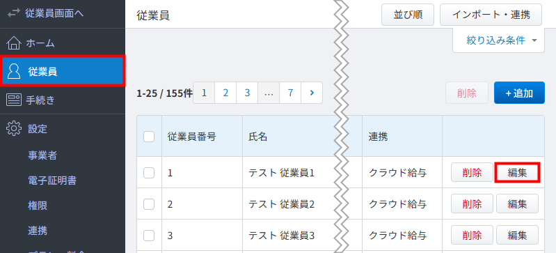 - 「従業員」画面で「ログインID」を設定する従業員の「編集」をクリックします。