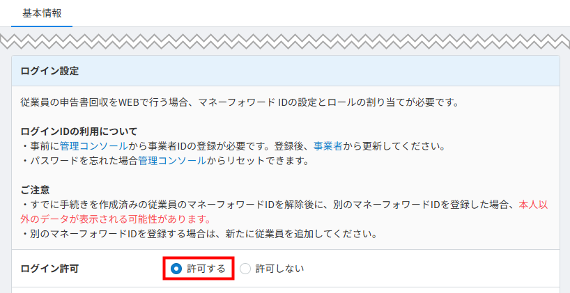 従業員が「ログインID」を利用してログインする場合は、「事業者ID」の設定が必要です。
