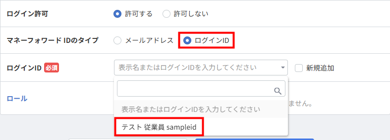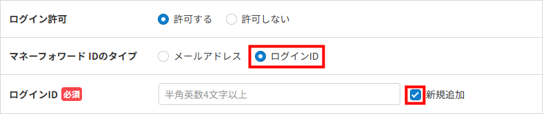 - 「マネーフォワード IDのタイプ」で「ログインID」を選択し、「新規追加」にチェックを入れます。