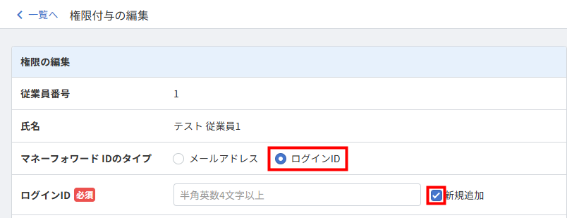 - 「権限付与の編集」画面の「マネーフォワード IDのタイプ」で「ログインID」を選択し、「新規追加」にチェックを入れます。