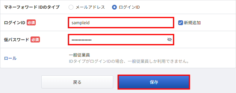 - 「ログインID」と「仮パスワード」を入力し、保存します。