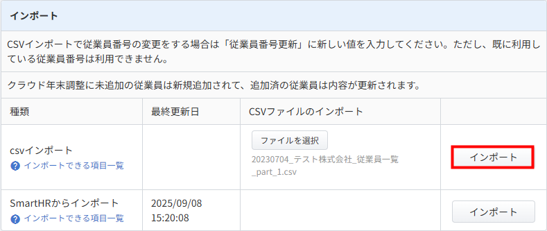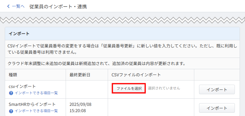 - 「従業員のインポート・連携」画面の「インポート」で、「csvインポート」の「ファイルを選択」をクリックします。