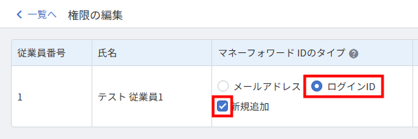 - 「権限の編集」画面の「マネーフォワード IDのタイプ」で「ログインID」を選択し、「新規追加」にチェックを入れます。
