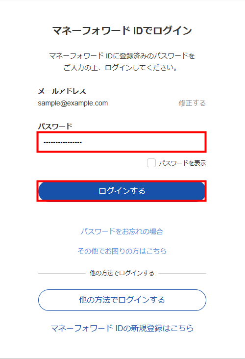 - 「マネーフォワード IDでログイン」画面で「メールアドレス」を選択し、メールアドレスを入力して「ログインする」をクリックします。