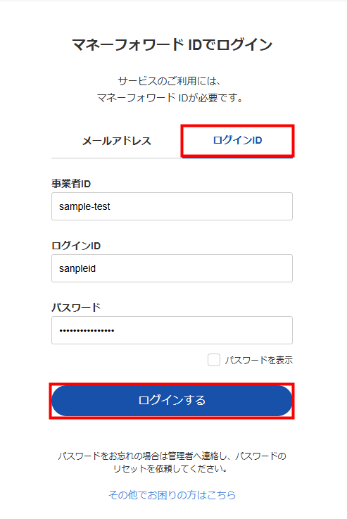- 「マネーフォワード IDでログイン」画面で「ログインID」を選択し、「事業者ID」「ログインID」「パスワード」を入力して「ログインする」をクリックします。