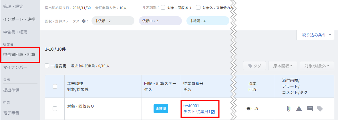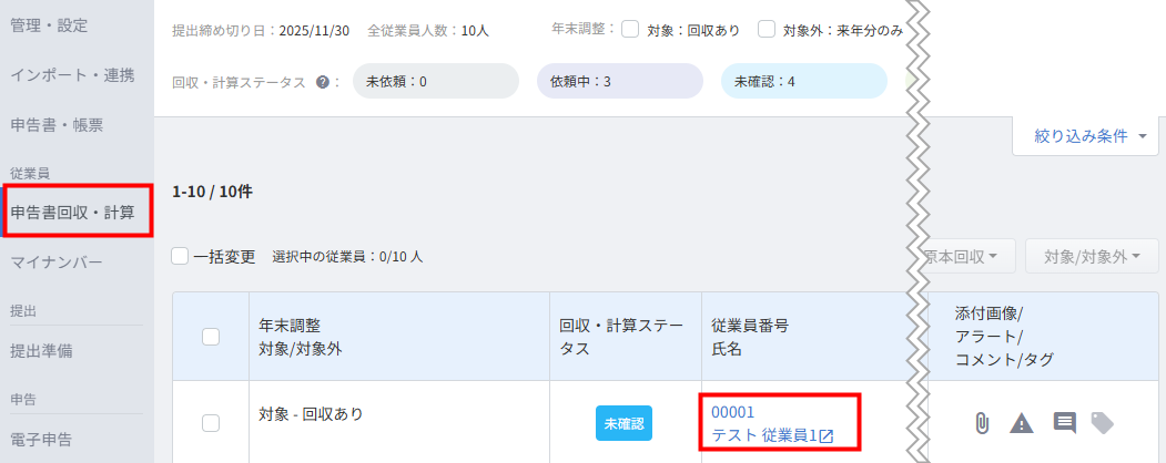 - 「申告書回収・計算」画面で従業員の「従業員番号 氏名」をクリックします。