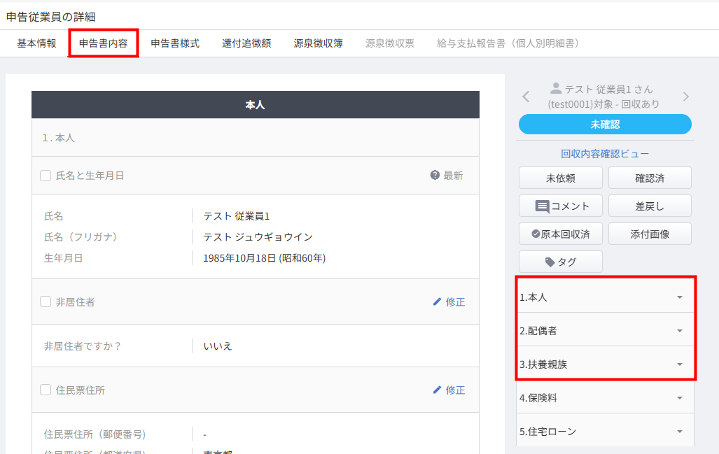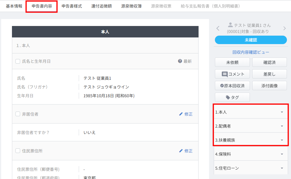 - 「申告従業員の詳細」画面で「申告書内容」タブをクリックし、「1.本人」「2.配偶者」「3.扶養親族」を選択します。