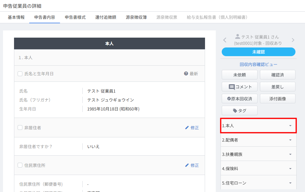 - 「申告従業員の詳細」画面で「申告書内容」タブをクリックし、「1.本人」を選択します。