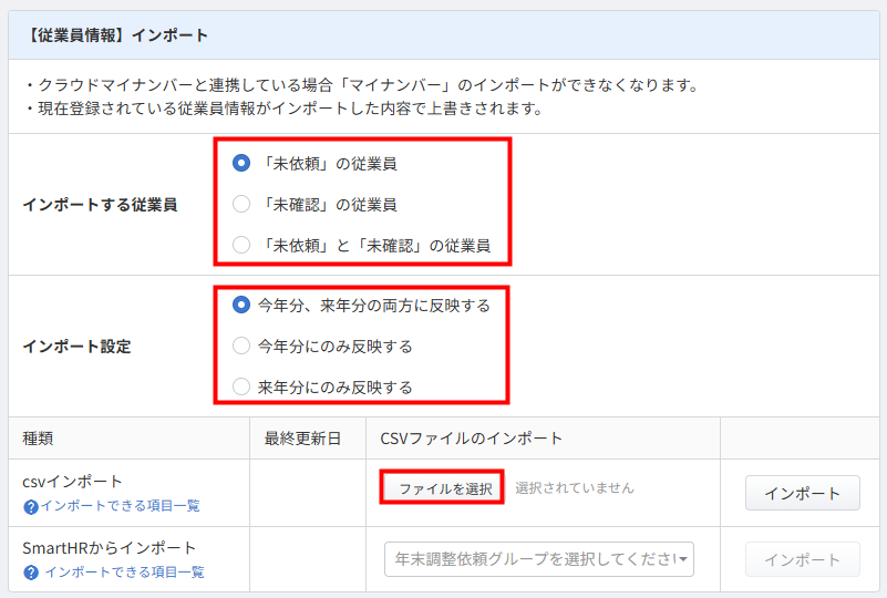 - 「【従業員情報】インポート」にある「インポートする従業員を選択」と「インポート設定」で対象の従業員と設定の反映年を選択し、「CSVインポート」の「ファイルを選択」をクリックします。