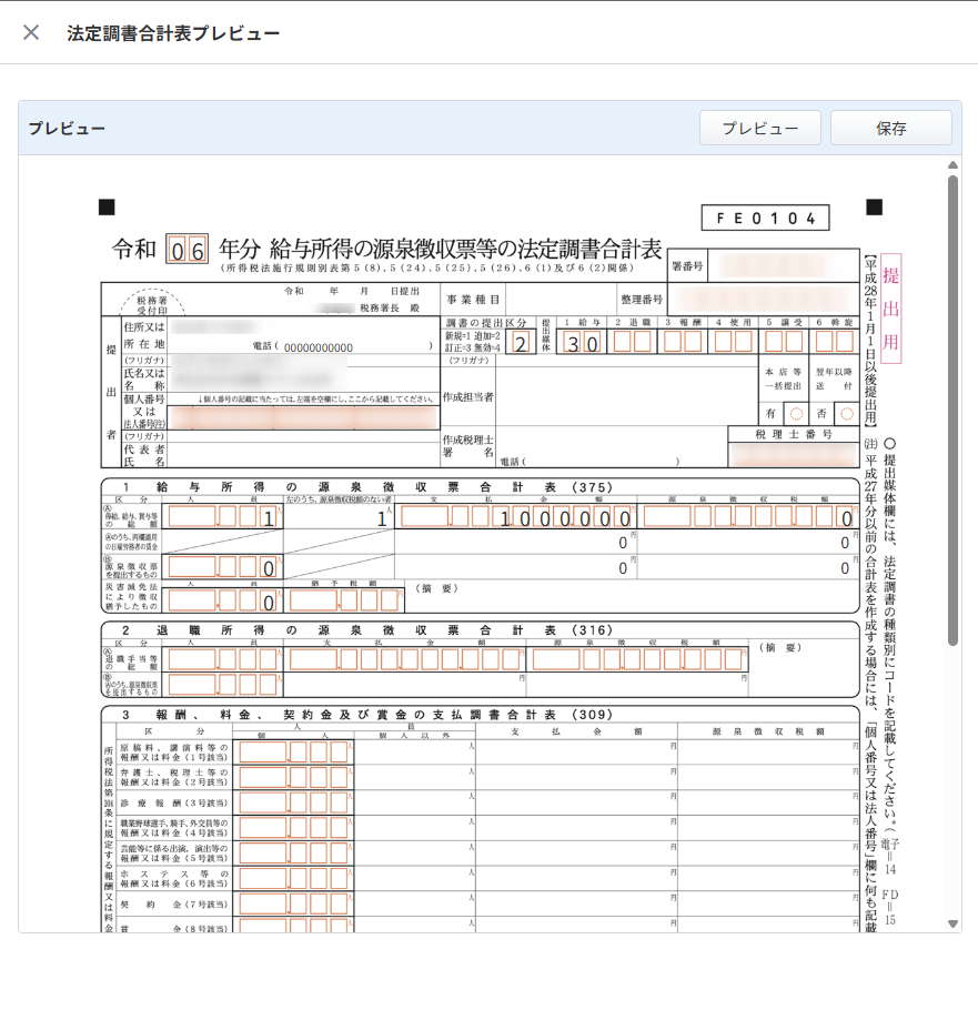 - 「法定調書合計表プレビュー」画面で印字内容に問題がないかを確認します。