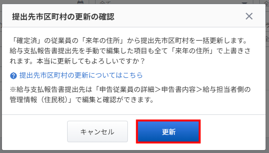 3. 「提出先市区町村の更新の確認」画面で給与支払報告書の提出先を設定します。