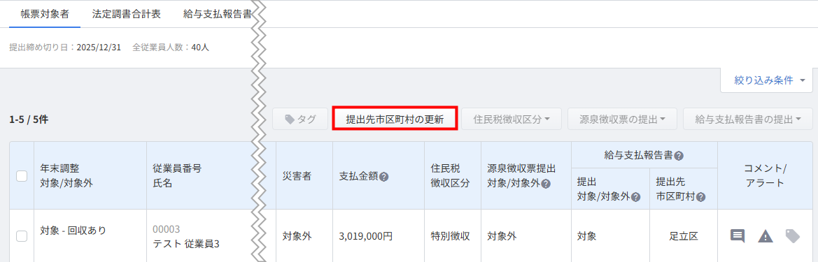 2. 「帳票対象者」画面で「提出先市区町村の更新」をクリックします。