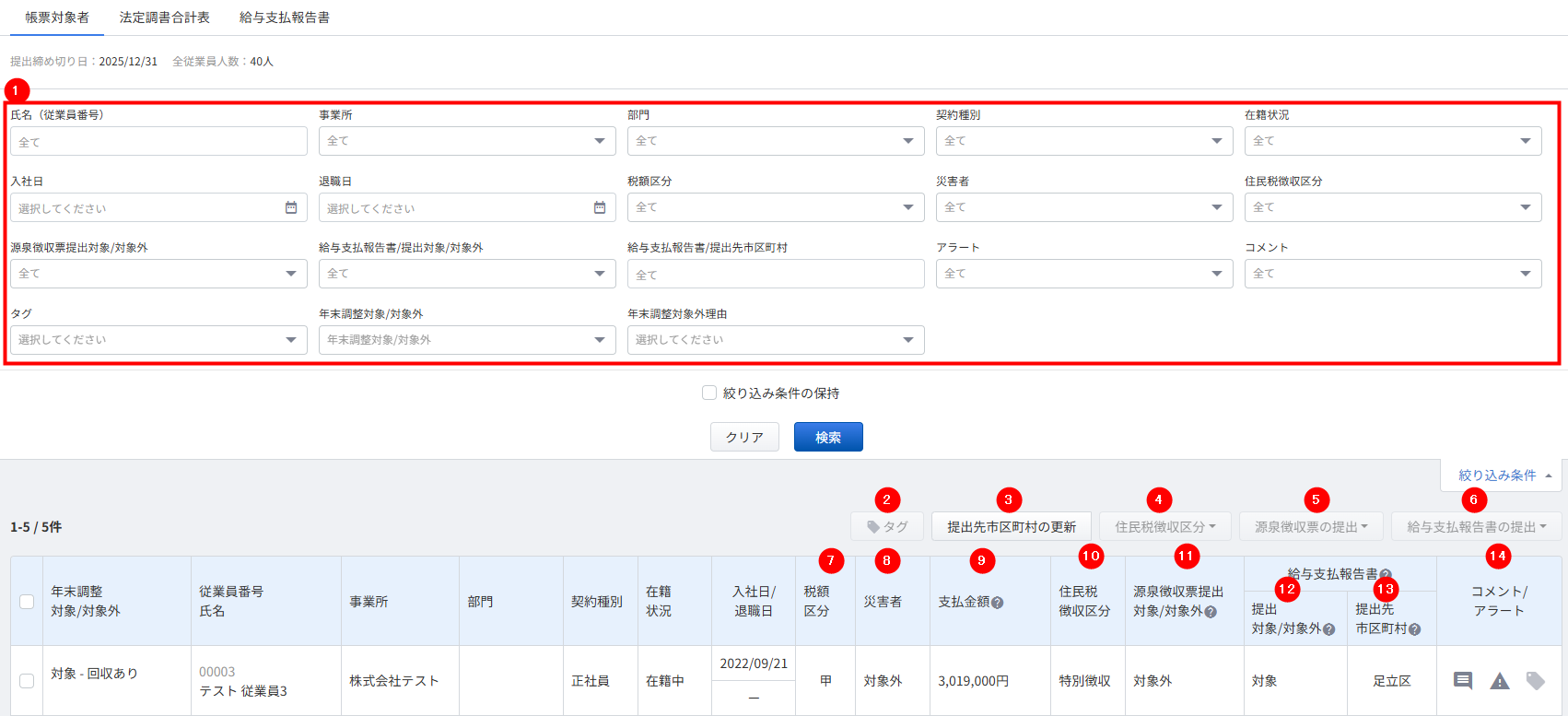 給与支払報告書提出対象/対象外給与支払報告書が提出対象かどうかが表示されます。