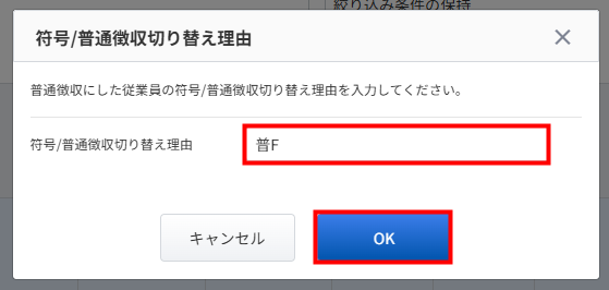 3. 「符号/普通徴収切り替え理由」画面で切り替え理由を入力し、「OK」をクリックします。