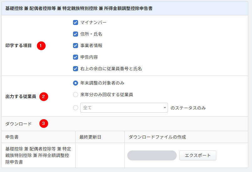 ② | 出力する従業員 | 申告書を出力する従業員を選択できます。