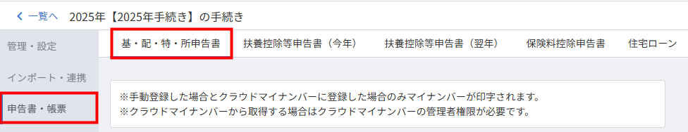 - 「申告書・帳票」をクリックし、「基・配・特・所申告書」タブを選択します。